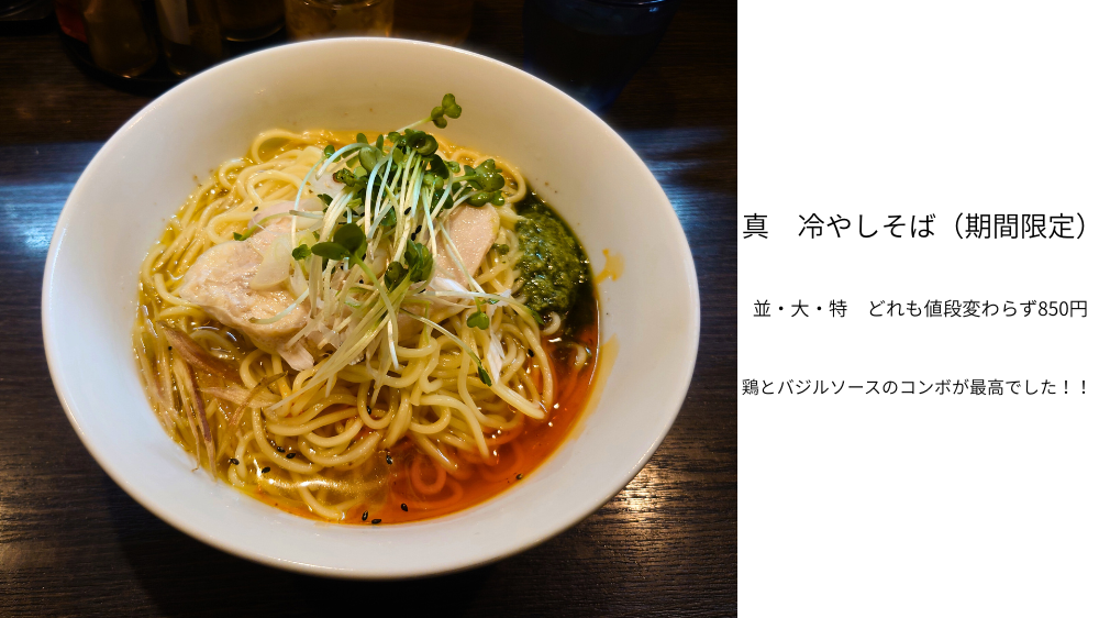 どのラーメンを注文したかまでは触れられていないので、アニメでも登場したお店の看板にある「真 冷やしそば」を注文をしました。